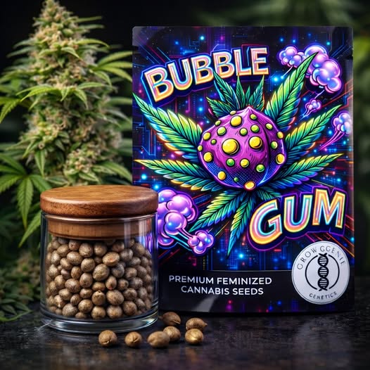 Bubble Gum von Grow-Genie-Genetics ist eine hochpotente, indica-dominante Hybrid-Sorte (80 % Indica / 20 % Sativa), die mit extremem Ertrag, intensiv süßem Aroma und einer kraftvollen, euphorisch-entspannenden Wirkung überzeugt. Die exklusive Kreuzung Bubble Gum × Gelato Zkittlez vereint klassischen Candy-Flavor mit moderner Dessert-Genetik – ein echtes Highlight für Kenner süßer Terpenprofile.